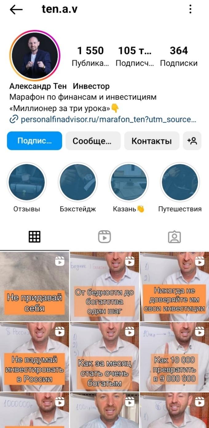 Свой блог Александр ведет в социальной сети Инстаграм. Его поддерживает аудитория из 105 000 пользователей. Здесь 1 550 публикаций и все они в виде коротких reels. Посвящены видео увеличению бюджета и тому, как правильно инвестировать. Никаких статистик мы не обнаружили, кроме обещаний автора, ничего нет.