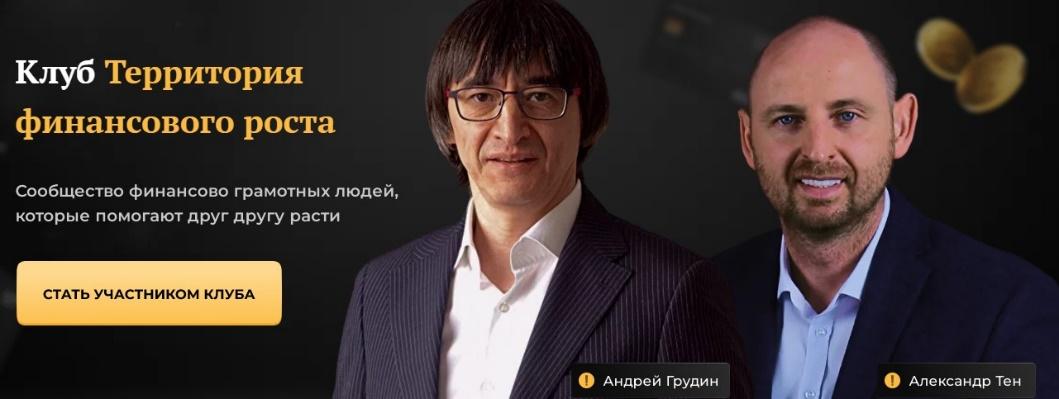 Начать проходить программу можно после перехода в Телеграмм. Ссылка перенаправит к боту, который будет рекламировать трейдера и в итоге предложит присоединиться к команде «Территории финансового роста». Клубом руководит инвестор Александр Тен и Андрей Грудин. На главной странице обещают: