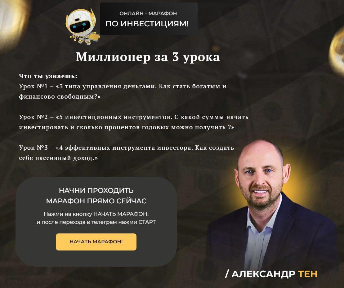 Александр Тен — инвестор и предприниматель, который предлагает обучение, посвященное инвестированию. Он создал тренинги и выпустил 3 книги на тематику бизнеса. Александр уверяет, что знает как сделать так, чтобы каждый клиент начал получать большую прибыль. Предлагаем рассмотреть обзор, чтобы узнать, безопасно ли доверять трейдеру.
