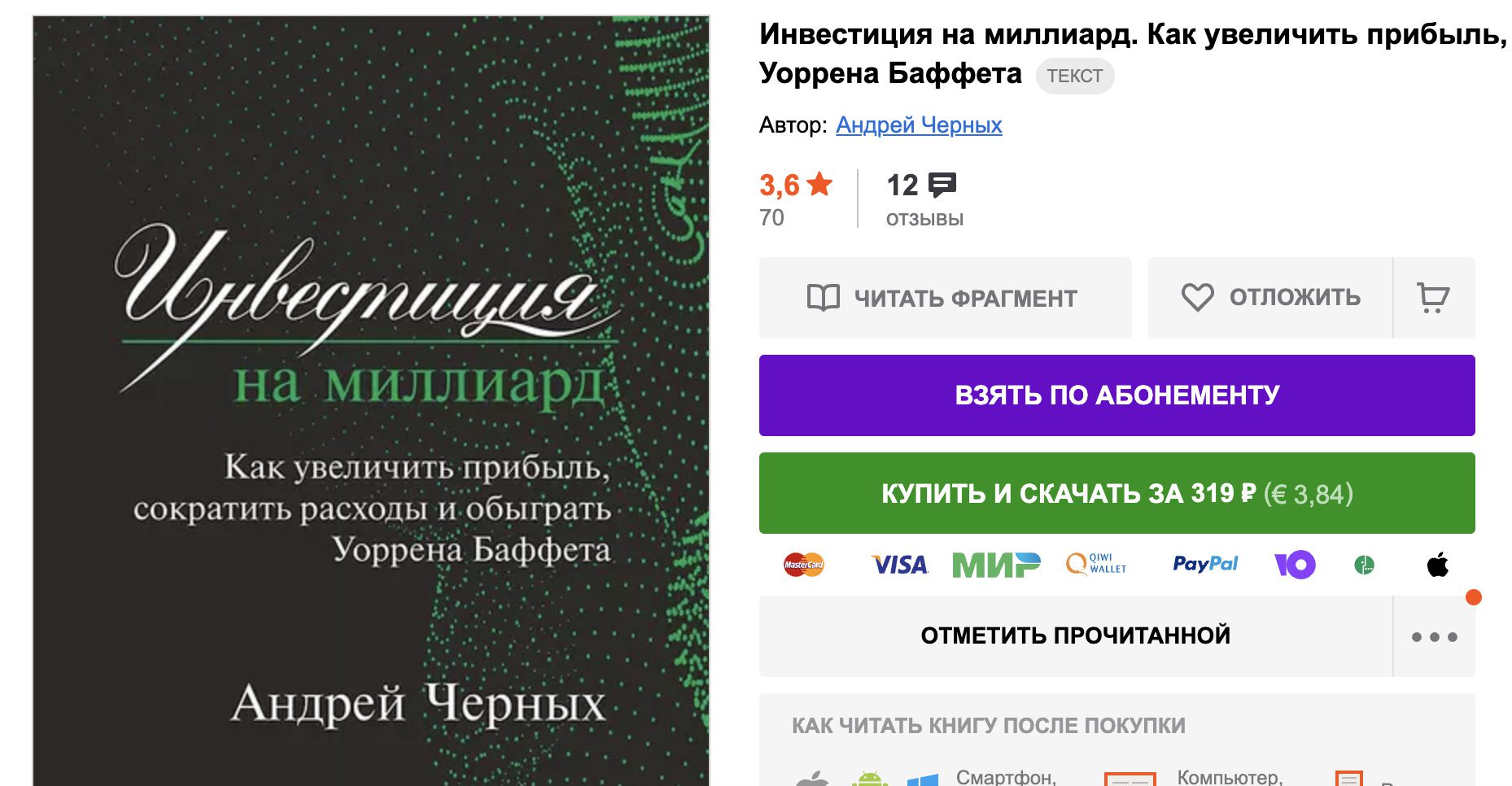 Андрей Черных зарабатывает на продаже своей книги «Инвестиция на миллиард. Как увеличить прибыль, сократить расходы и обыграть Уоррена Баффета» и обучении, а не на торговле.