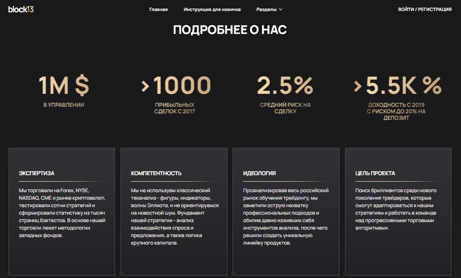 На своих ресурсах трейдер BLOCK 13 сообщает пользователям о том, что он и его якобы команда имеет колоссальный опыт торговли на таких финансовых рынках, как Forex, NYSE, NASDAQ и CME, и на крипто-биржах — Binance и OKX.