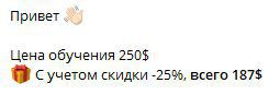 Получается следующая картина: вы проходите в Telegram канал неизвестного автора, почти полностью забитый рекламой курсов и его команды. Но нигде не написана цена, а когда вы уже пишете самому владельцу канала — вы видите стоимость обучение в 250 долларов. И вы не знаете, насколько полезны эти курсы.