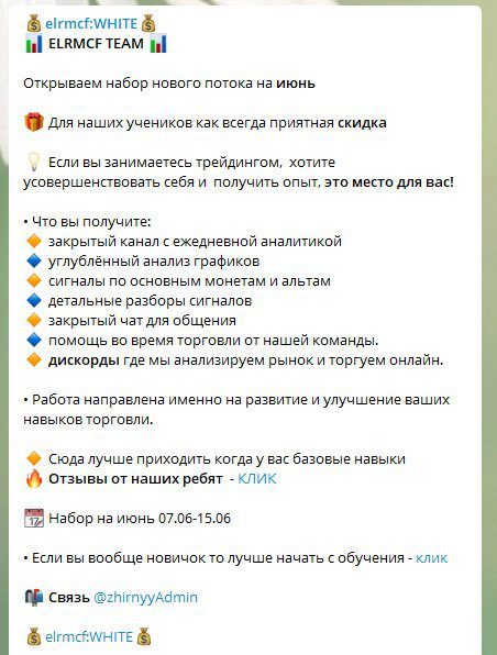 Elrmcf:WHITE — это Telegram канал под авторством некоего трейдера Георгия. В нем он выкладывает новости криптовалют, актуальные white-листы. Однако, основным его товаром является месячные курсы обучения трейдингу и приглашения в закрытый канал с ежедневными сигналами. Мы внимательно изучили деятельность данного канала и выяснили, стоит ли покупать его обучение.