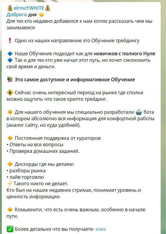 Elrmcf:WHITE — это Telegram канал очередных мошенников, цель которых заставить новых клиентов купить бесполезные курсы. Хоть обучение и выглядит масштабным и полным, оно не представляет из себя ничего кроме грязного болота с маленькими выдержками информации из интернета.
