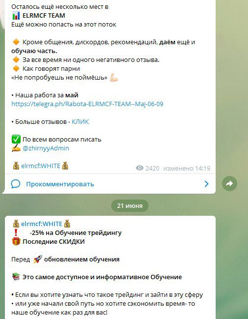 Telegram канал представляет собой лишь площадку, где Григорий просто старается набрать людей в свою команду и на свои курсы. Очень редко такое “Разнообразие” разбавляется новостями криптовалют и актуальными white-листами. Еще иногда появляется реклама сомнительных брокеров и других, подобных ему, трейдеров. Сигналы тоже появляются, но они настолько редкие, что о них можно даже забыть. Всего на elrmcf подписано 19 тысяч человек, но при этом его посты смотрят лишь около 3 тысяч человек, что показывает явную накрутку подписчиков для большей статусности.
