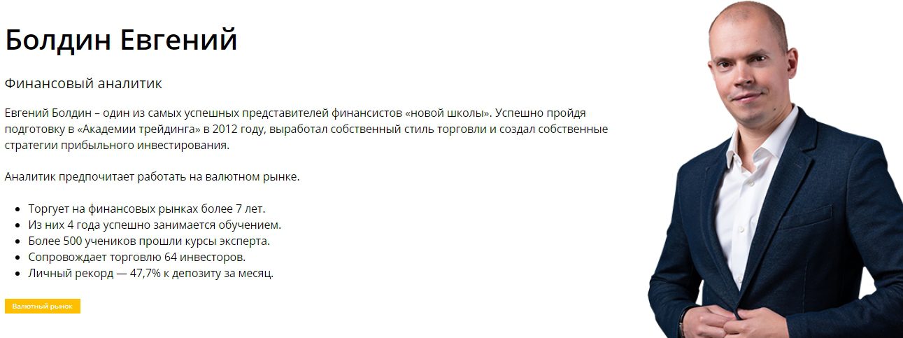 Евгений Болдин — трейдер и финансист с опытом работы более 7 лет. Последние 4 года он занимается преподавательской деятельностью, обучая всех, кто решил попробовать свои силы на рынке. Можно ли доверять этому человеку, узнаете далее.