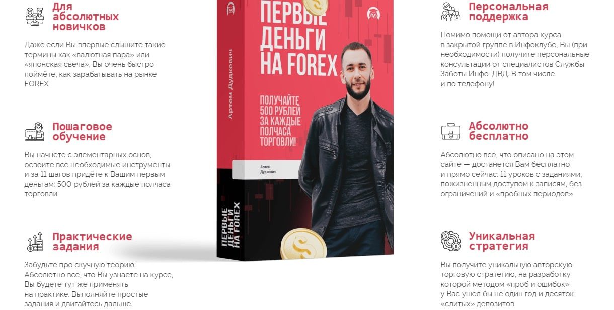 На своем ютуб канале Форекс Профит активно занимается продвижением своих авторских курсов. Если смотреть статистику под роликами, то большая часть из них набирает от 50 до 500 просмотров. Можно сделать вывод, что контент никому не интересен.Под роликами располагаются ссылки на несколько авторских программ. Есть бесплатный курс “Первые деньги на Forex”, который можно получить на сайте издательства “Инфоклуб” только при заполнении заявки. Данные будут использоваться для дальнейшего влияния на клиента с целью продать платные продукты.