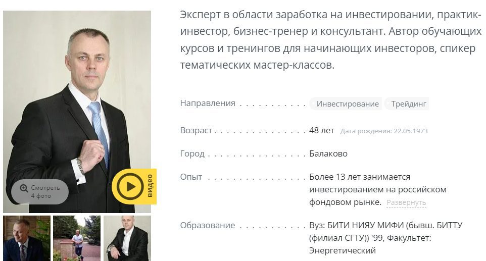 По заявлениям автора проекта, у него высшее образование в энергетической сфере. На финансовый рынок он пришел более 13 лет назад. Сегодня занимается обучением спекуляции на бирже. Благодаря инвестициям, аналитик якобы получил полную свободу в жизни, чтобы заниматься спортом, отдыхать и проводить время с семьей.