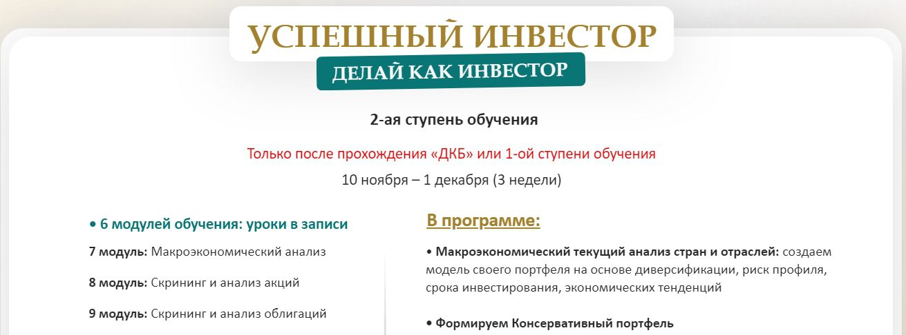- “Успешный инвестор” — 6 модулей;