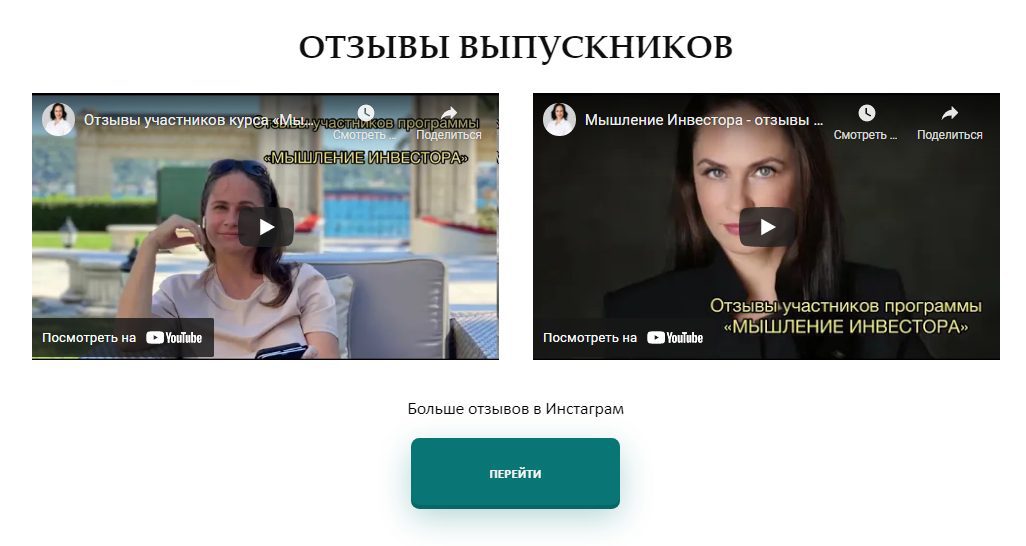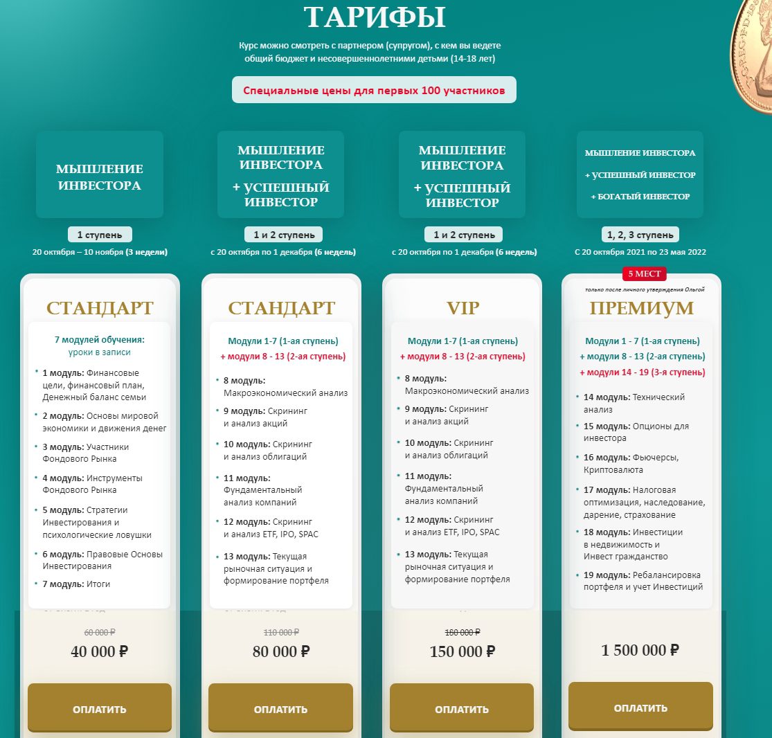 - тарифный план “Премиум” включает в себя первую, вторую и третью ступень обучения (“Успешный инвестор”, “Мышление инвестора” и “Богатый инвестор”), стоимость которого составляет 1,5 млн рублей.