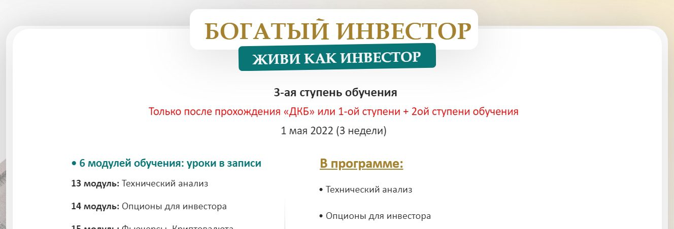 - “Богатый инвестор” — 6 модулей.