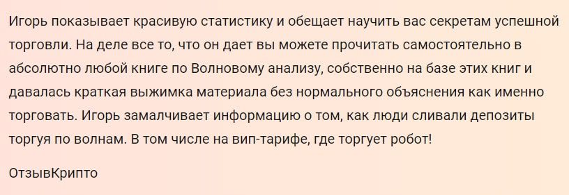 Prime Crypto — сообщество трейдеров, которое предлагает несколько обучающих трейдингу программ. Основатель Игорь Андреев был замечен и в других Телеграмм каналах, где подписчикам продавали услугу разгона депозита на криптовалютных сделках, а по сути разводили их на деньги. В сети о трейдере мнение негативное.