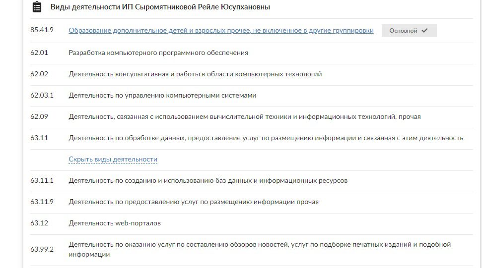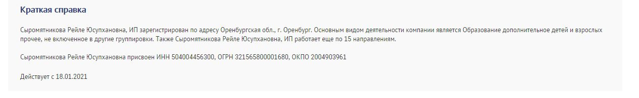 Из плюсов деятельности Рейле Сыромятниковой является только то, что она зарегистрирована как ИП, и в перечне видов деятельности указаны образовательная и консультационная.