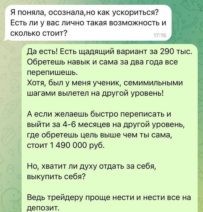 Для клиентов доступны несколько курсов, основные из них “Биржа и я”, “Матрица трейдера” и “Театр теней”. Их точная стоимость на личных ресурсах Сыромятниковой не указана, в паблике периодически появляется их реклама, но цены разные.
