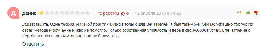 У спекулянта два образования: авиационное и туризм, но каким образом он сумел стать крутым трейдером – неизвестно. Отзывы негативные, пользователи сомневаются в знаниях трейдера и эффективности тренингов о торговле. На сайте или социальных сетях Школы отзывов нет, но на других площадках есть: