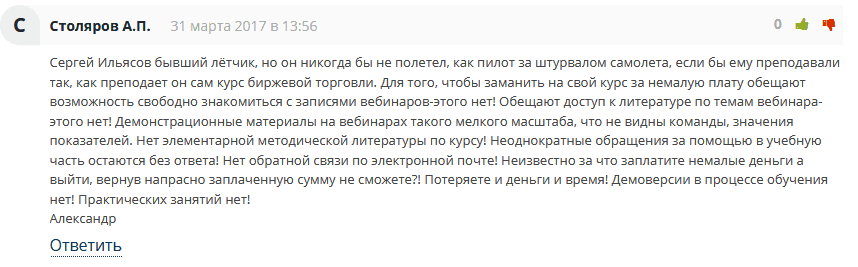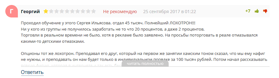 Отзывы о школе и курсе Сергее Ильясове исключительно негативные. Пользователи в отзывах называют трейдера сказочником, а курс – лохотроном. По реакции других пользователей на негативные отзывы заметно, что много людей соглашается («+7»).