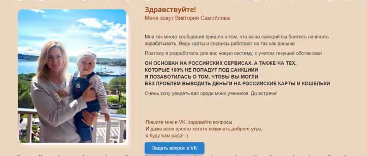 Сайт проекта – примитивный одностраничник. Его оценочная стоимость – 5 рублей. В еще на нем нет подтверждений тому, что Виктория Самойлова существует. Мошенники просто взяли фотографию привлекательной девушки, пытаясь представить ее в роли эксперта по пассивному заработку. На самом деле они продают курс, который давно бесплатно доступен в интернете.