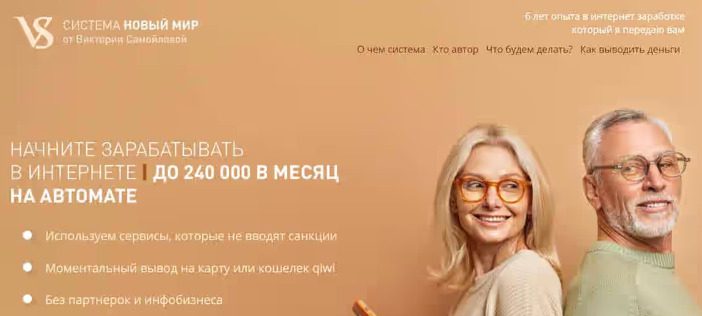 Система Новый Мир – курс, автор которого обещает клиентам возможность зарабатывать до 240 000 рублей ежемесячно. Виктория Самойлова пишет, что разработала стратегию, которая в комбинации с использованием специального приложения для автоматизированной торговли, позволяет совершать безубыточные сделки. На самом деле девушка уже несколько раз меняла название своего проекта, чтобы скрыться от отрицательных отзывов бывших клиентов.