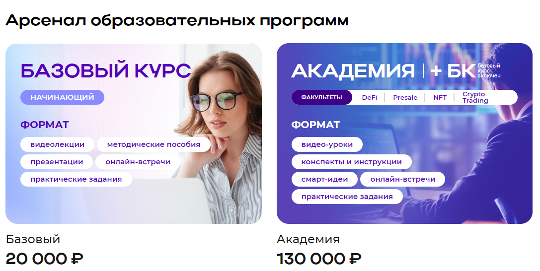 Академия — это углубленный курс длительностью 3 месяца. Он предназначен для более продвинутых пользователей. В него входят обучение на нескольких факультетах, таких как DeFi, NFT, Presale и Crypto Trading. Формат обучения включает видеоуроки, конспекты и инструкции. Также пользователям предоставляются смарт-идеи. Предусмотрены онлайн-встречи и практические задания. Стоимость обучения составляет 130 000 рублей.