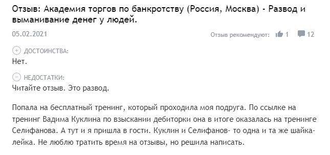 При изучении соцсетей академии дебиторской задолженности о торгах по банкротству Куклина Вадима, отзывы оказались сугубо положительными. Немного странно, что всем клиентам нравится деятельность спекулянта. В реальности комментарии публикуются непосредственно мошенником для придания себе имиджа. Ведь в любой работе, особенно преподавательской, должна быть конструктивная критика и негатив.