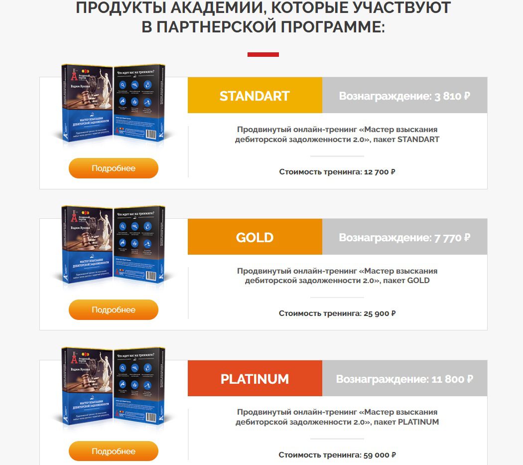На официальном сайте аналитик, кроме обучающих курсов, предлагает участие в партнерской программе по продвижению курса «Мастер по взысканию дебиторских задолженностей 2.0», в которой предусмотрено три уровня: