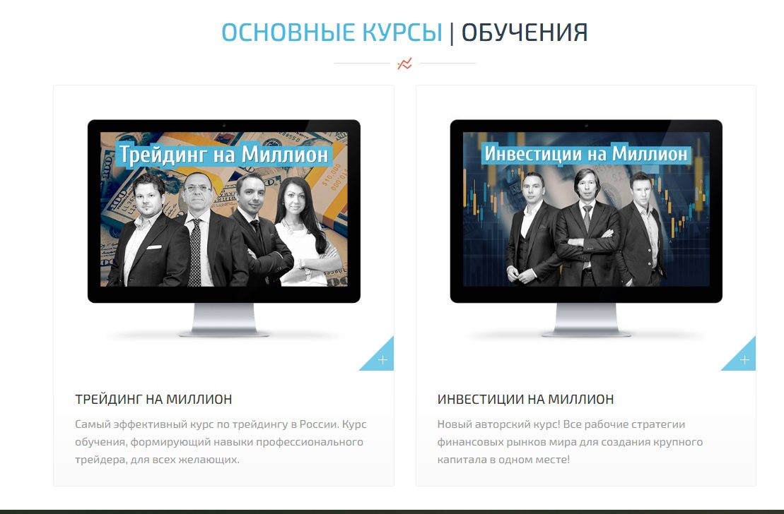 - “Трейдинг на миллион” содержит массу информации от нуля до профи, которую составили преподаватели. По словам авторов, осваивая данный курс, за две недели сможете выйти уже в рынок и получать свой первых доход;