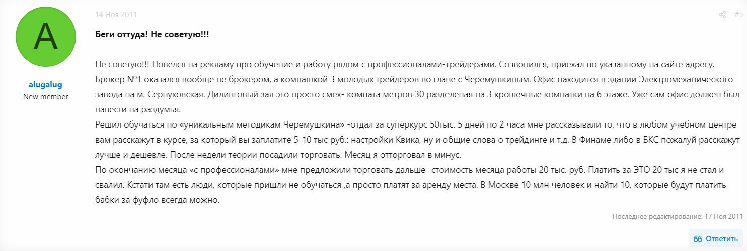 Красиво написанное описание компании на сайте, заведомо несет в себе ложные обещания о чудесном успехе клиента. К сожалению, подтверждений работ учеников не имеется, также как и уровень доходов инвесторов. Работа трейдерских программ не подтверждена и, судя по отзывам, они только мешают совершать сделки.