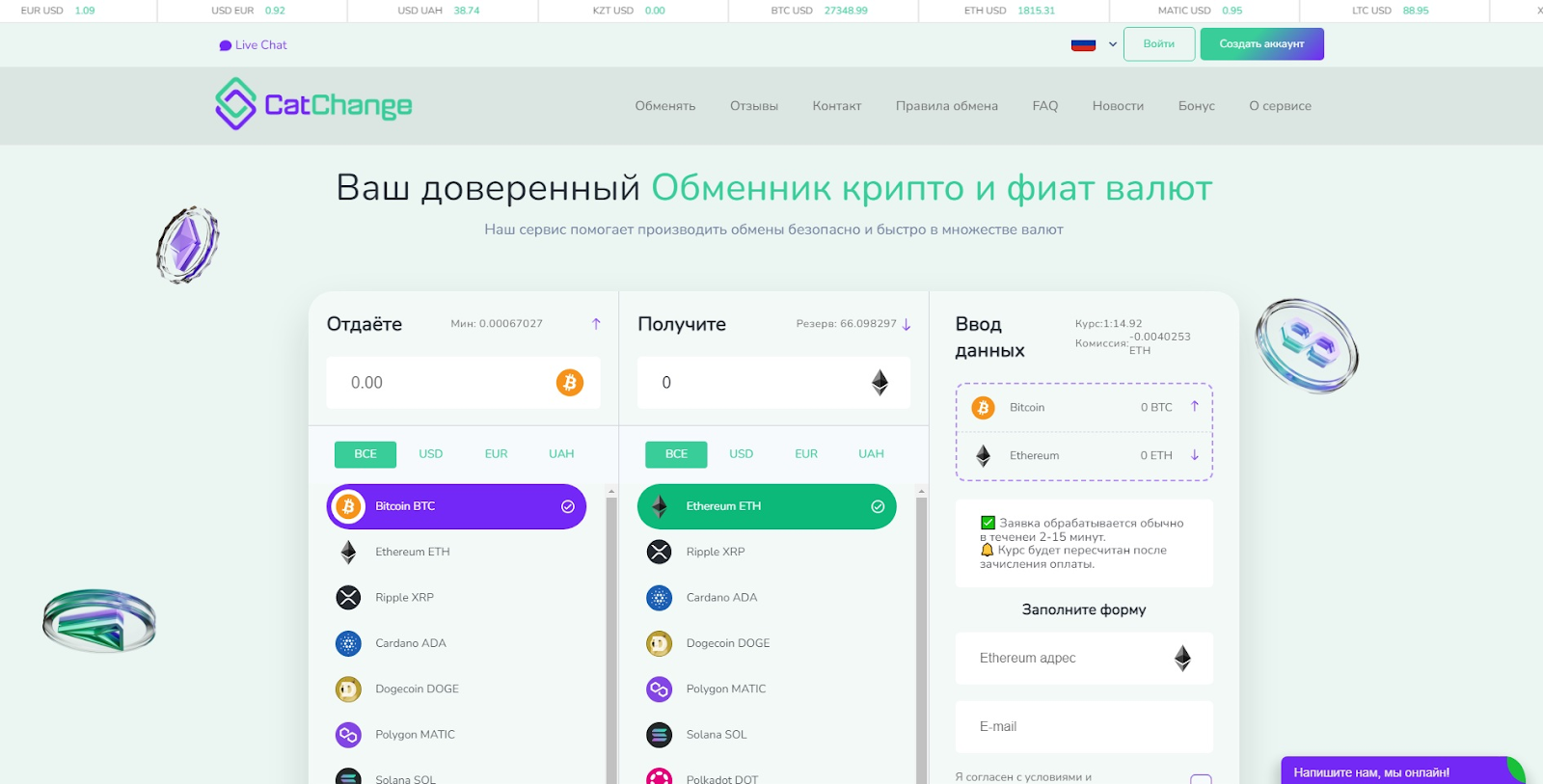 На главной странице Catchange сайт встречает пользователей простой формой: «Отдаете» и «Получаете». Доступен обмен десятков криптовалютных активов — от классических биткоинов и эфира до USDT, TON и стейблкоинов. Из фиата платформа поддерживает рубли, доллары и евро. Простой дизайн делает работу с обменником удобной даже для новичков.