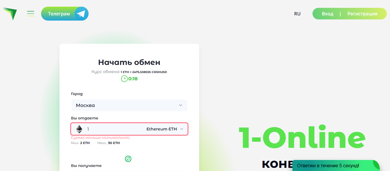 Площадка 1 Online ru реализована на современном движке с адаптивным дизайном. Меню предлагает быстро выбрать направление – «Крипта в фиат» или «Обмен USD/EUR внутри сети». Пользователь видит актуальный курс и комиссию ещё до начала операции, а обменный калькулятор выводит итоговую сумму в режиме реального времени. При выборе ETH → CASH USD достаточно указать сумму и заполнить реквизиты, после чего система генерирует платежные инструкции.