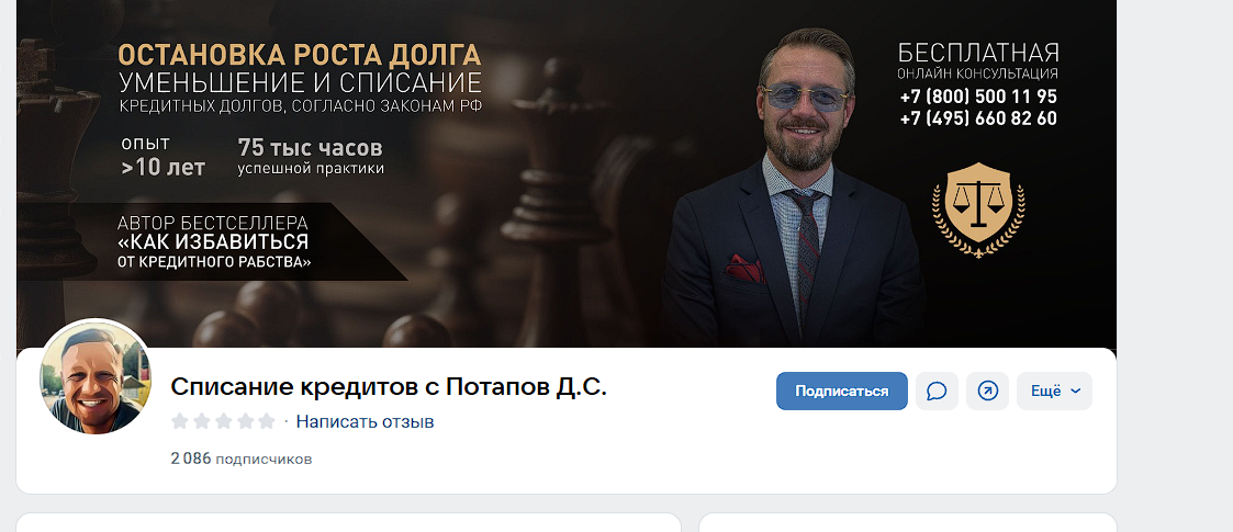 Эта платформа появилась 2023 году. Её создатель – Дмитрий Потапов из Москвы, который якобы работает с кредитованием. Он открыто демонстрирует лицо и записывает много разговорных роликов по теме. Также Дмитрий называет себя автором бестселлера “Как избавиться от кредитного рабства”. Но доказательств существования такой книги мы не нашли.