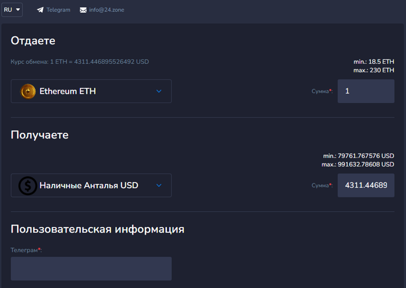 Связаться с менеджерами можно в чате техподдержки Info 24 zone в Телеграме. График приема заявок аналогичен графику самого обменника – с понедельника по пятницу с 9 утра до 21.00 по Москве.