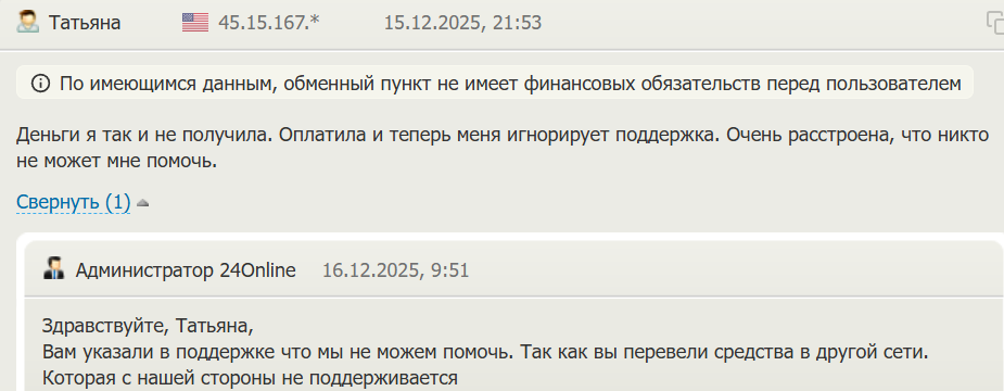 А вот следующий клиент в своем отзыве про обменник 24 Online сообщает, что деньги так и не пришли ему на счет. Однако поддержка предоставила свой ответ на данный комментарий. По ее мнению, клиент отправил перевод не в той сети. Мы не знаем, кто прав в данной ситуации, но тот факт, что компания «не прячется» от критики, говорит в ее пользу.