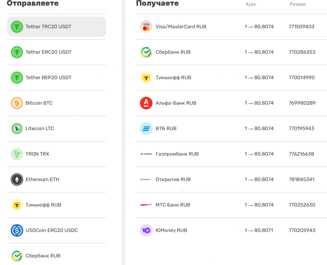 Система позволяет совершить обмен примерно десятка криптовалют, среди которых есть популярные USDT, BTC, ETH, TRX и другие. Выбор достаточно скудный по сравнению с конкурентами, что однозначно можно считать минусом этой платформы.