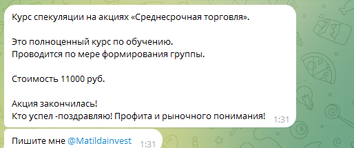 Матильда предлагает образовательные курсы, семинары по техническому анализу, подбору акций. Также пользователи могут получить помощь в составлении портфеля и в качестве дополнения войти в закрытый чат с сигналами. Стоимость услуг начинается от 2 тысяч рублей. Также доступ в чат с сигналами можно приобрести отдельно. Цена услуги не уточняется.