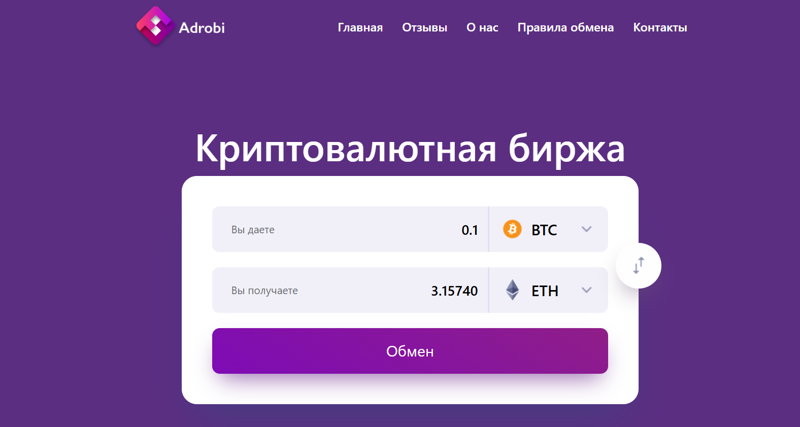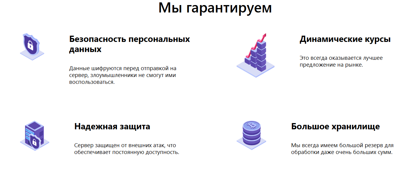 На данный момент обмен в Adrobi возможен как с одной криптовалюты на другую, так и покупка и продажа их с рублевых карт. На главной странице указано, что компания гарантирует высокий уровень надежности и безопасности. Сервис старается поддерживать высокие курсы за счет динамического обновления. Также упоминается большой резерв по каждому направлению. Тут представлено более 10 актуальных криптовалют, наиболее востребованных для клиентов.
