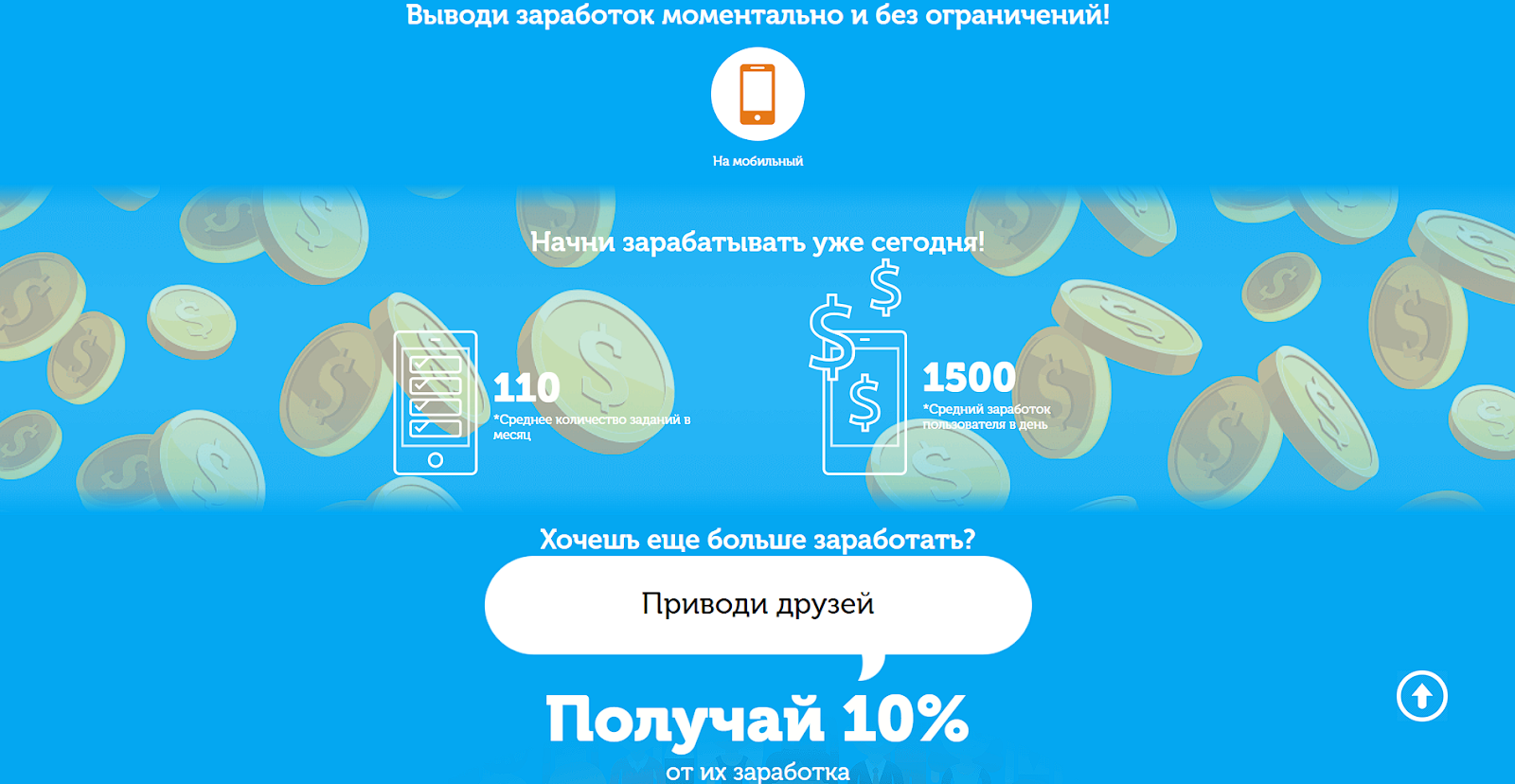 Сам проект на своем сайте обещает в среднем 110 заданий, а средний доход пользователей оценивает в 1500 рублей. Также для заработка можно использовать реферальную программу, которая способна приносить 10% от дохода приведенных друзей.