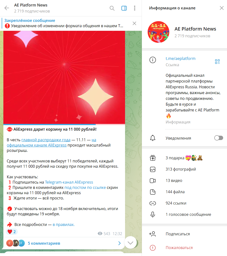 Есть канал AE Platform News в ТГ, в котором выкладывают новости AliExpress, подборки товаров, последние акции и информацию о бонусах. На 13 ноября 2025 года ресурс существует 4 года и 4 месяца.
