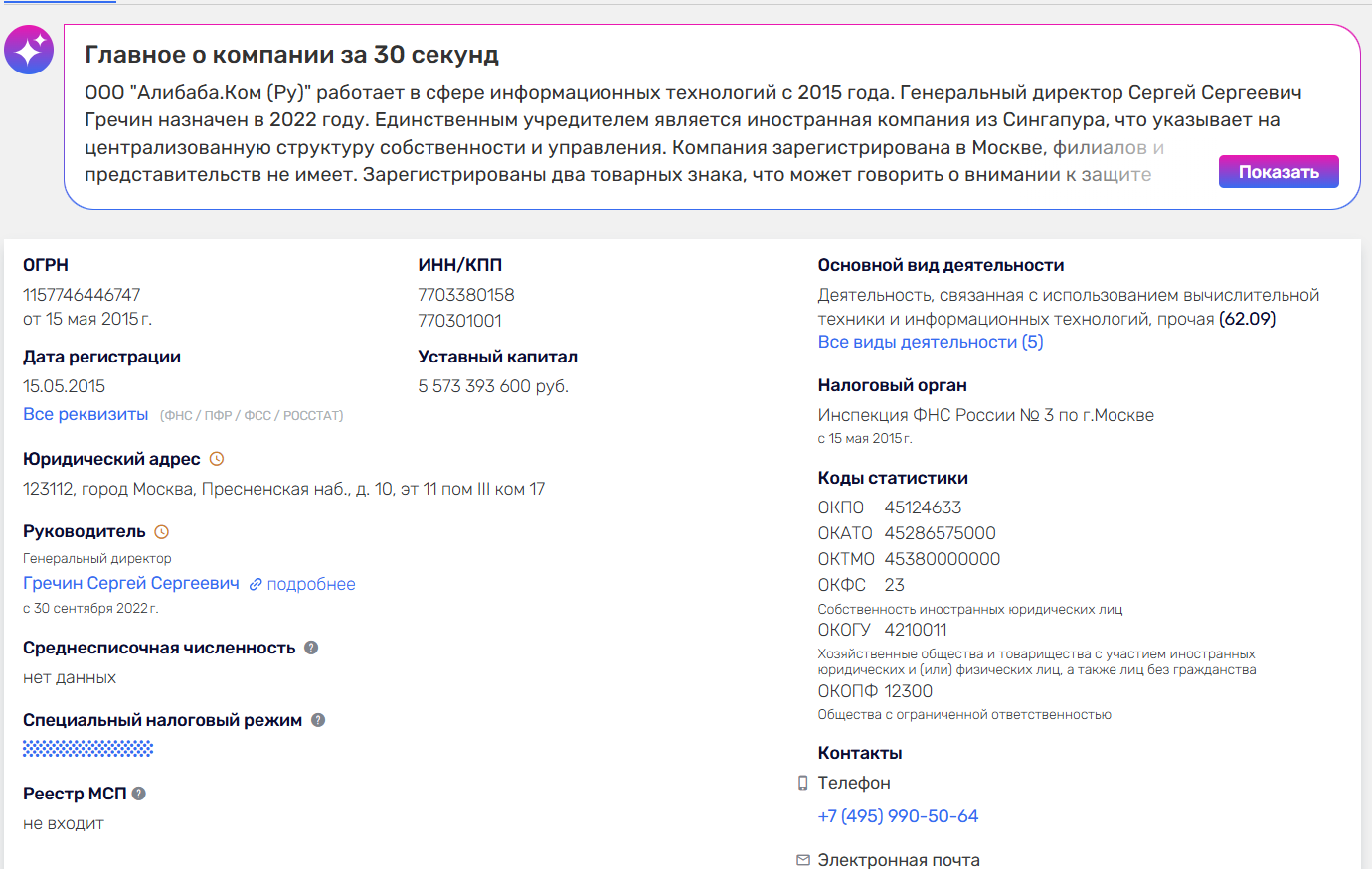 - компания официально зарегистрирована в России как ООО «Алибаба КОМ РУ», деятельность легальная;