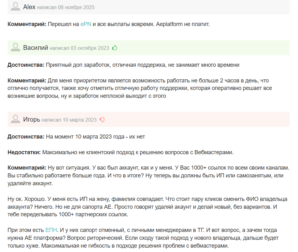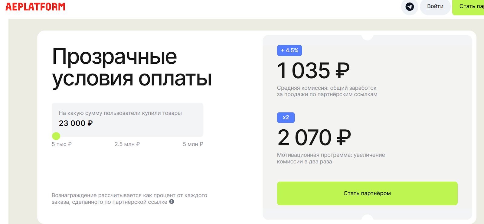 Условия работы с площадкой Ae platform, что подтверждают отзывы, просты. Надо зарегистрироваться, выбрать продукцию, которую будете продвигать, указать, с какой платформы вы будете это делать, получить реферальную ссылку и ждать покупок. Обычный комиссионный сбор со сделки – 3%, но многое зависит от категории товаров и других условий. Например, за новинки платят 5%, максимальный показатель за все время – 30%.