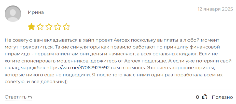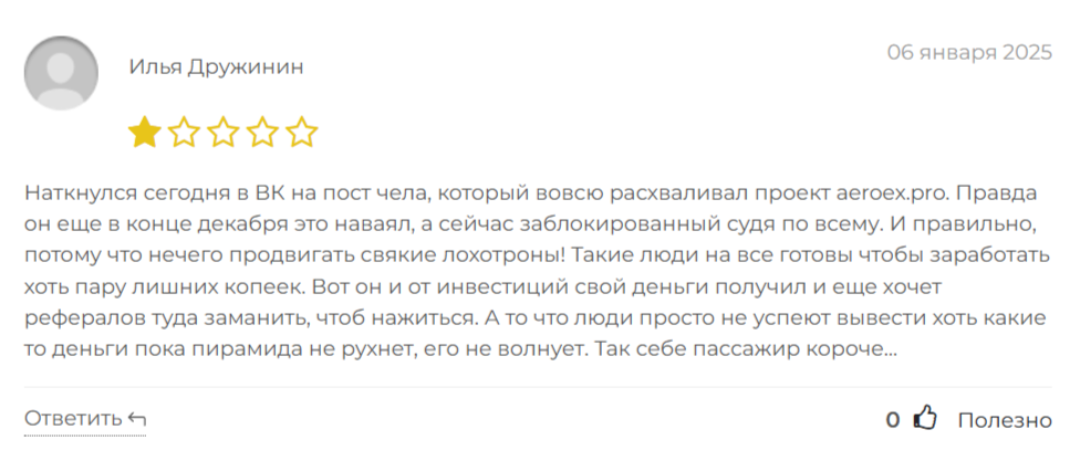 На сторонних сайтах отзывы о Aeroex PRO далеки от идеала. К примеру, Ирина рекомендует инвестировать деньги в хайп проект. Она утверждает, что сервис работает по принципу пирамиды, и выплаты могут в любой момент прекратиться. Первые клиенты еще могут получить деньги, после чего платежи останавливаются.