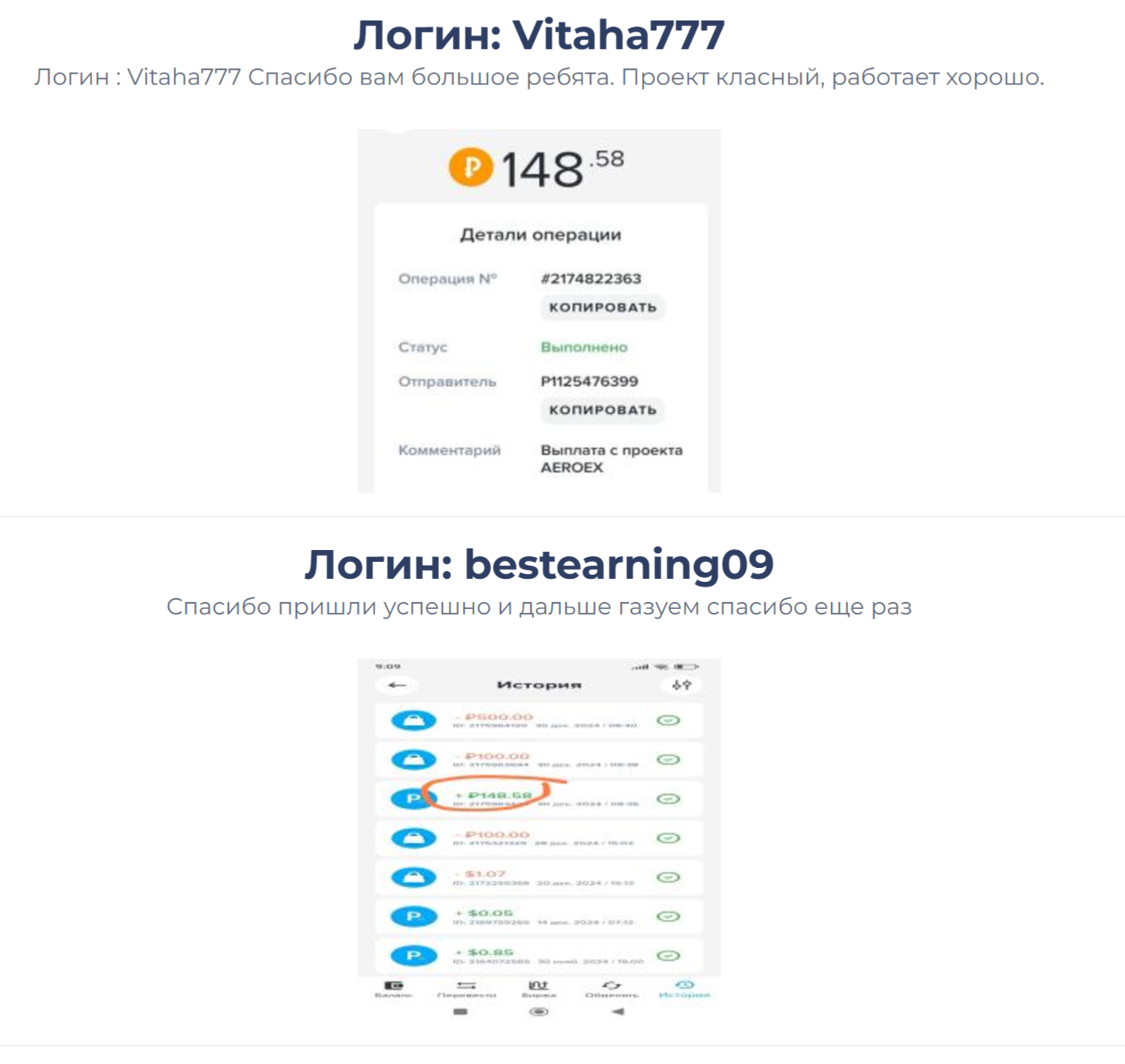 На официальном сайте сервиса доступен целый раздел с отзывами о AeroexPRO. В них можно увидеть текстовое сообщение, оставленное клиентом, и скрин вывода. Также указывается логин, чтобы повысить уровень доверия к информации.