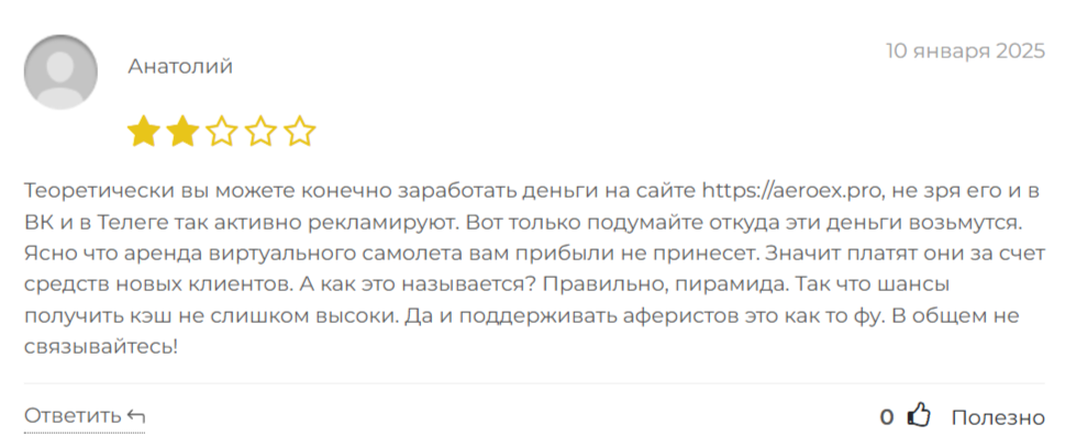 Анатолий допускает, что в теории заработать на Аэроэкс можно, но он сомневается в потенциале проекта. Ему не понятно, откуда берутся деньги, ведь аренда самолета не несет прибыли. Это означает, что выплаты осуществляются за счет уже приведенных клиентов. Следовательно, шансы получить реальные деньги минимальны.