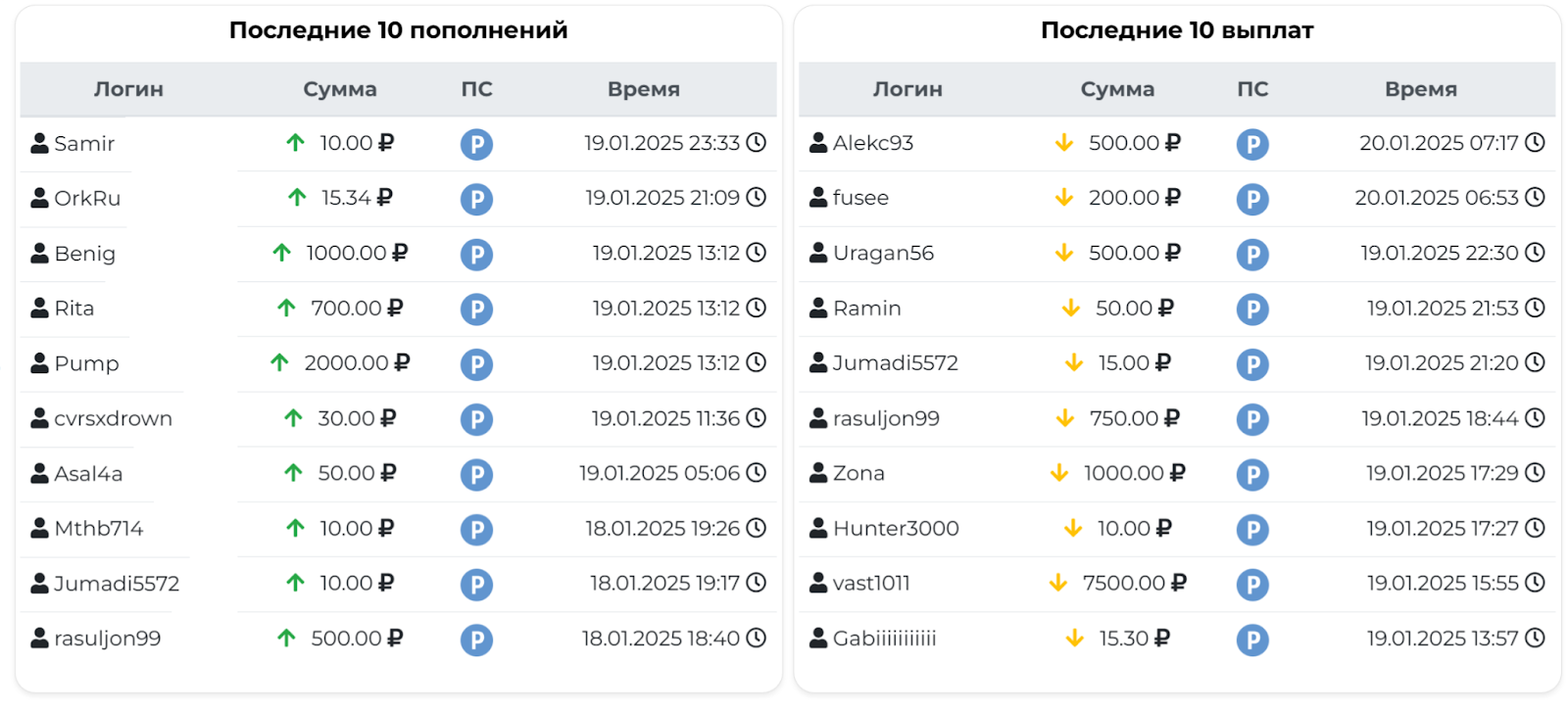 На ресурсе AeroexPro приводится таблица, в которой указываются текущие пополнения и выплаты клиентов. Их анализ показывает, что размер платежей сравнительно небольшой. Чаще всего пользователи вносят и выводят небольшие суммы — до 1000 рублей.