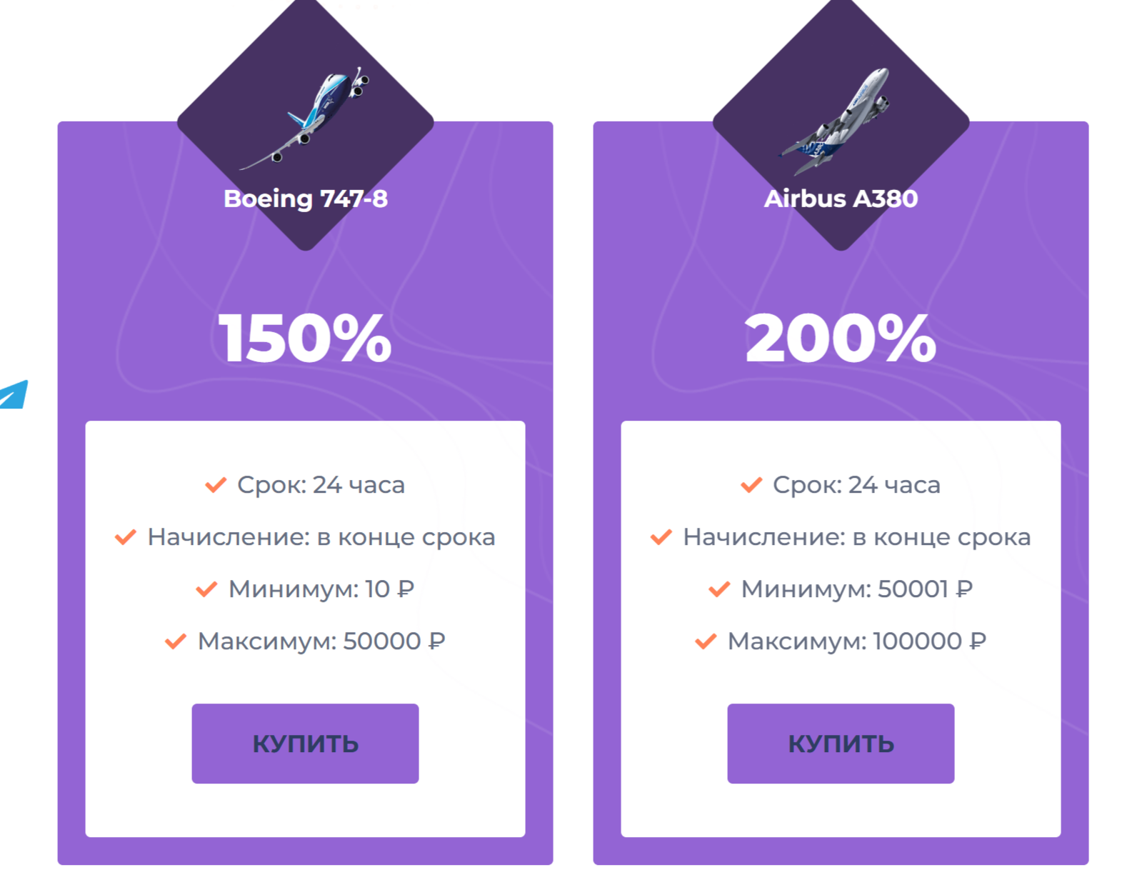 - Boeing 747-8. Предусматривает вложение денег на срок до суток с начислением в конце установленного периода. Минимальная и максимальная сумма вложений составляет 10 и 50 тыс. рублей. Размер потенциальной прибыли — 150%.