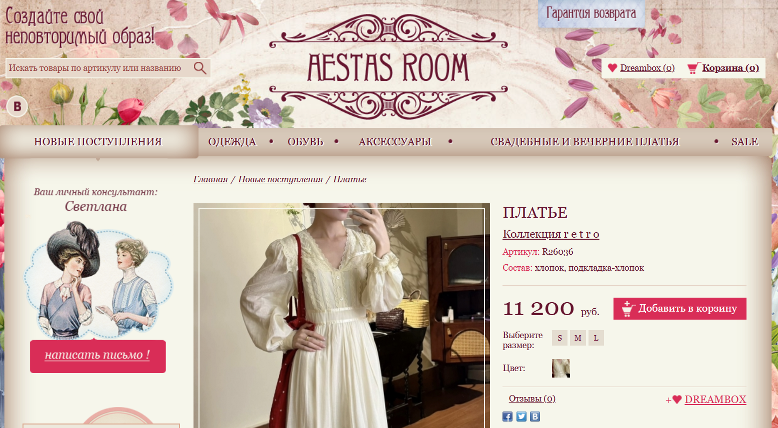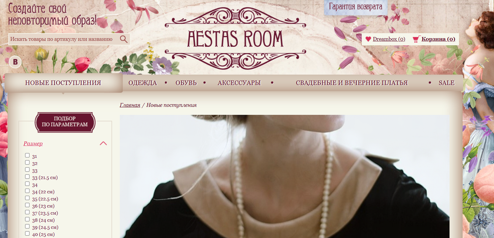 По сниппету сайта видно стандартное товарное дерево каталога: «Новые поступления», «Одежда», «Обувь», «Аксессуары», «Свадебные и вечерние платья», «SALE». Нишу проект выбрал узкую и понятную — женская одежда и обувь с акцентом на романтизированную ретро-подачу.