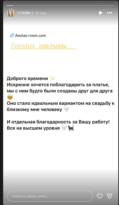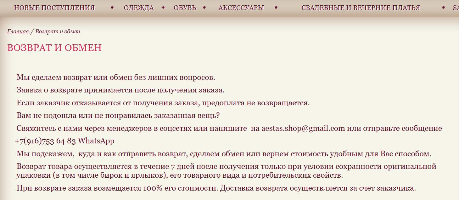 Найти в интернете отзывы о Aestas Room как о продавце женской одежды, обуви и аксессуаров не получилось. Нет упоминаний о проекте на крупных маркетплейсах, форумах, сайтах-отзовиках.
