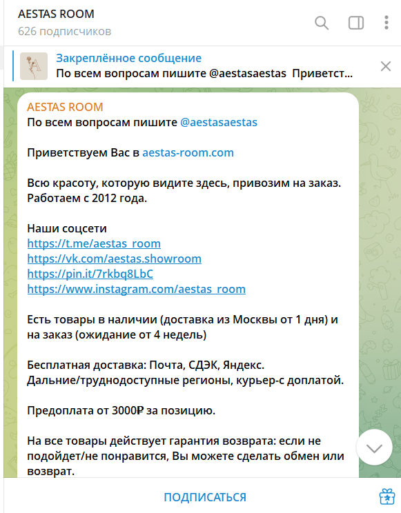В канале предлагается связаться с ТГ-контактом Aestasaestas для обсуждения покупки, озвучиваются условия сделки: доставка от 1 дня до 4 недель, предоплата каждого товара от 3000 рублей, доставка почтой России, СДЭК и Яндекс, гарантируется 100% возврат средств.