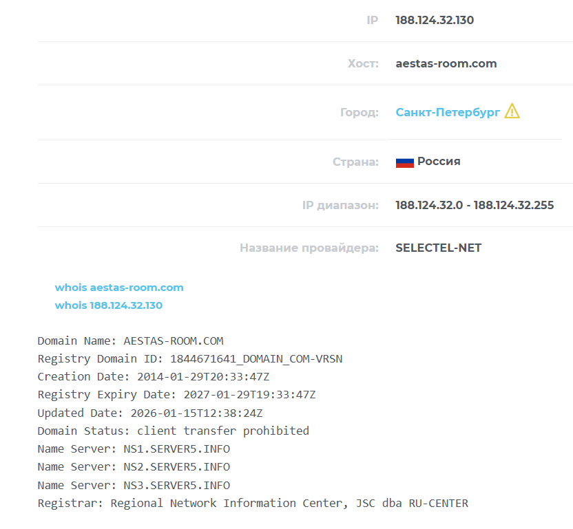 Домен Aestas Room Com зарегистрирован 29.01.2014 года, дислокация по IP — Россия, данные владельца скрыты.