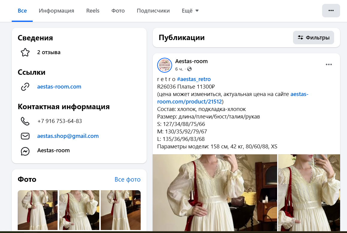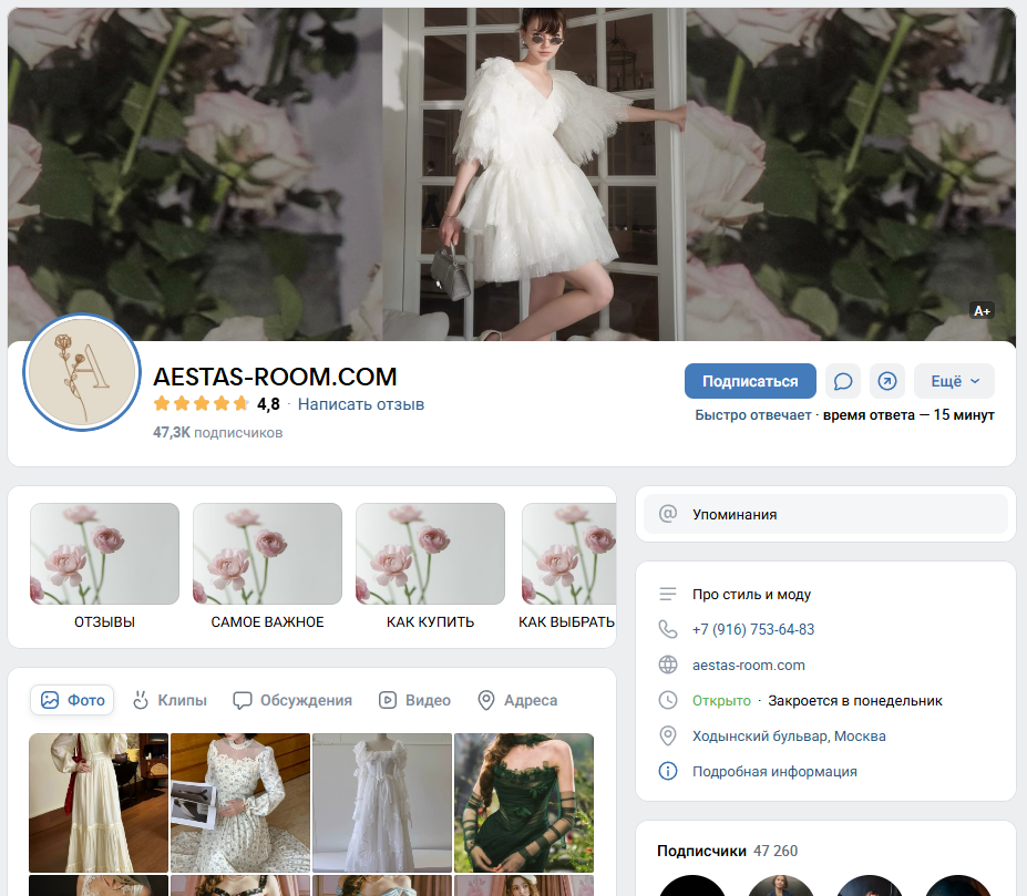 Во ВКонтакте проект описан общей формулой «Про стиль и моду», там же указан сайт Aestas-Room Com и российский номер телефона.
