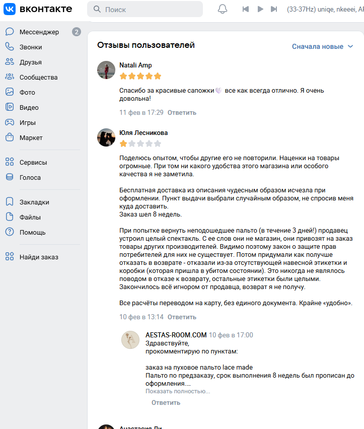 В сообществе ВК несмотря на большое количество откликов с 5 звездами встречается развернутый негатив. Одна из покупательниц жалуется на огромные наценки, доставку 8 недель и неадекватную реакцию администрации магазина на ее замечания.